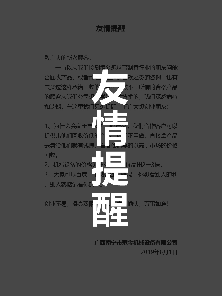 購買冠今制香機(jī),享受八大保證,讓您創(chuàng)業(yè)無憂!冠今制香機(jī)八大支持保證系統(tǒng):強(qiáng)力支持 后顧無憂 1.現(xiàn)場觀摩:免費(fèi)在制香廠里參觀各種香生產(chǎn)流程,滿意后再做決定。 2.專業(yè)培訓(xùn):購制香機(jī)...